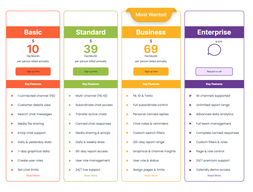 Depends. Basic is Facebook only. Standard adds Instagram. Business adds SMS stuff through Twilio. So most businesses land on Standard or Business. Other platforms charge separately for each channel so honestly Kuikwit is cheaper because they include it.
